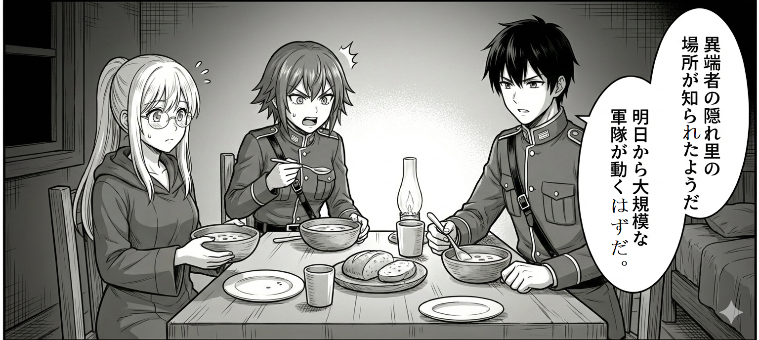 湯気が立ち上がる質素な机を囲み、三人の間に、主従でも、敵味方でもない、家族のような「絆」が、わずかに芽生え始めていた。