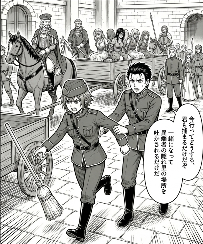 中庭を掃除していた時、遠くから勝ち誇ったような貴族男性たちの笑い声が聞こえてきた。見れば、リオンたちが新たな「異端者狩り」から帰還したところだった。馬車には、泥に汚れ、絶望した表情の女性たちが数人、檻に入れられて運ばれている。