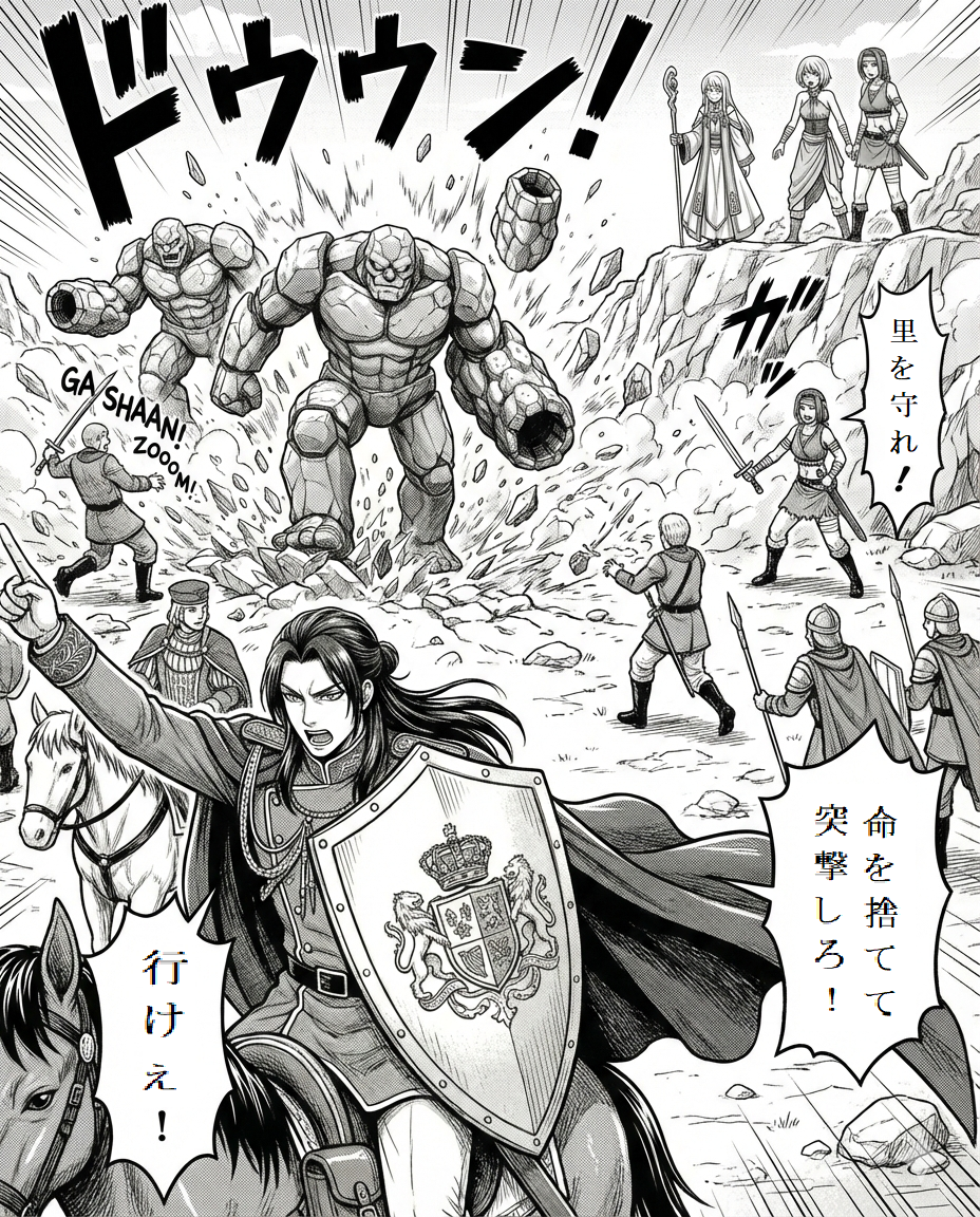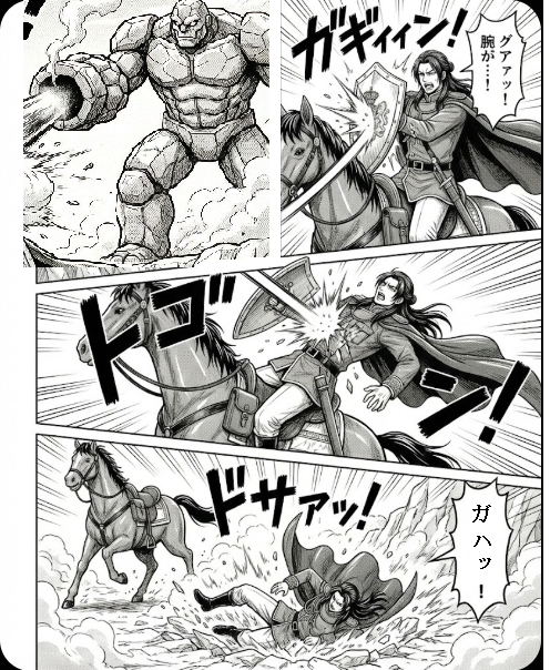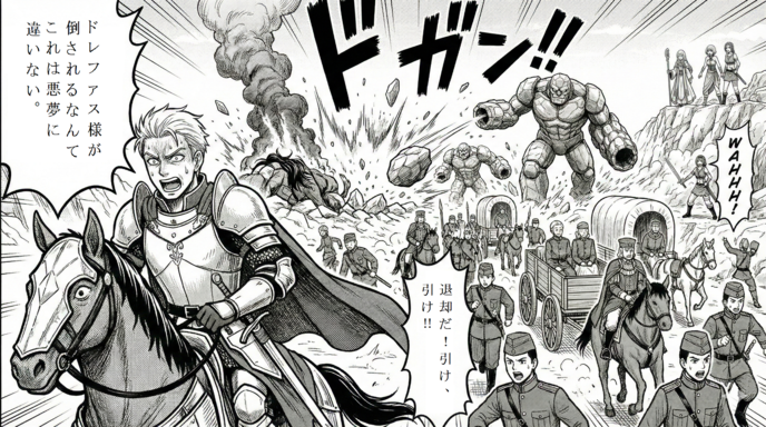 彼は咄嗟に魔法銀の大盾を構えたが、物理エネルギーの計算は非情だ。弓矢や魔法攻撃はドレファスの場所まで届かないだろうが、ゴーレムのカノン砲は攻城兵器に近い。1発、2発と岩弾が命中するたびに、盾はひしゃげ、彼の美しい腕の骨を粉砕した。そもそも盾なんかでカノン砲が防げるわけないのだ、義務教育くらいの問題だ。