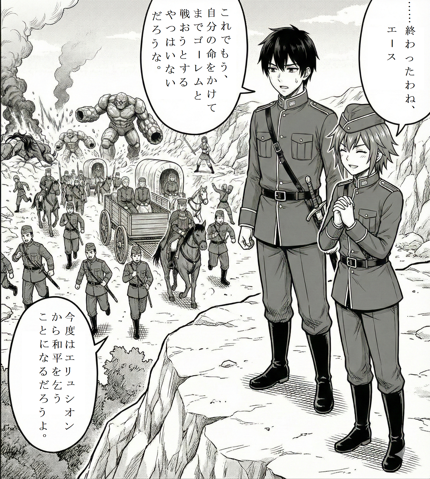 ゴーレムから逃げ惑うエリュシオン軍はまるで自分たちが攻めていたことを忘れてしまったかのようだった。その様はエリュシオンという歪んだ頂点が作り出した偽りの豊かさの崩壊が始まった、確かな合図でもあった。