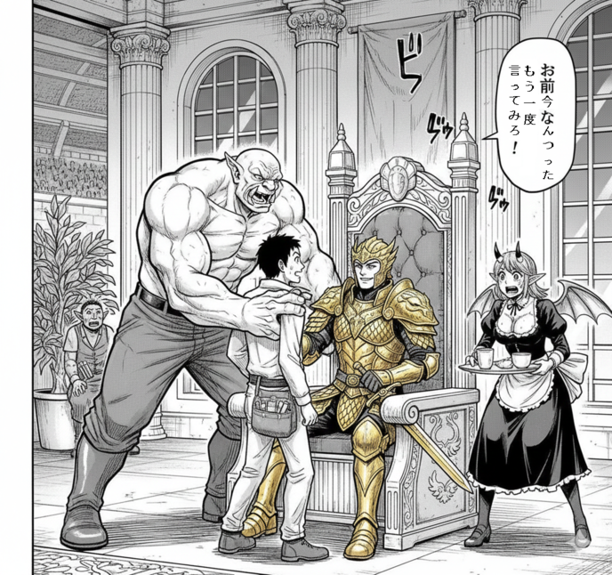 その足元には、怯えるような表情の給仕の少女(魔族)が侍っている。