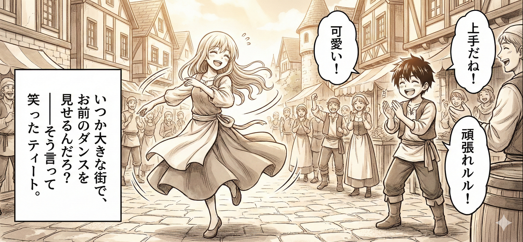 ――広場で踊る自分の姿。拍手。少年の笑い声。 ――「いつか大きな街で、お前のダンスを見せるんだろ?」そう言って笑ったティート。 ――それらすべてを、冷たい銀色の薬と、目の前の男の醜悪な笑みが踏みにじった。
