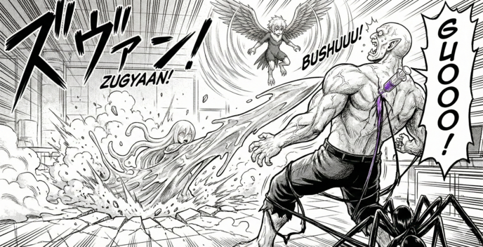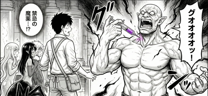 オーガーはその液体を自らの首筋に注入する。瞬間、彼の筋肉がさらに肥大化し、血管がどす黒く浮き上がった。禁忌の魔薬による強制強化。 だが、覚醒した三人の少女は、もはやその威圧感に屈することはなかった。