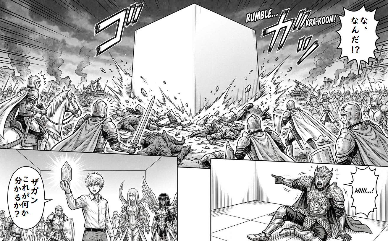 荒野に、地響きと共に「白」がせり上がった。 退却を始めていた聖騎士軍団と、意識を取り戻し始めた魔物たちのちょうど中心――そこに、広大な石造りの舞台が突如として出現したのだ。