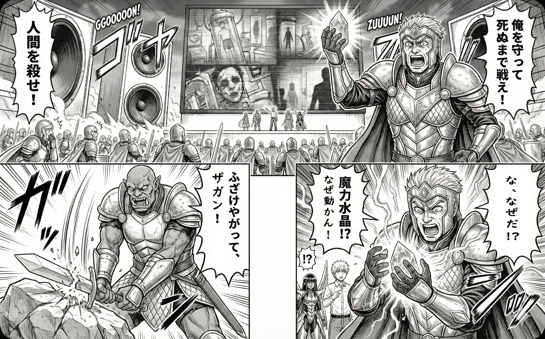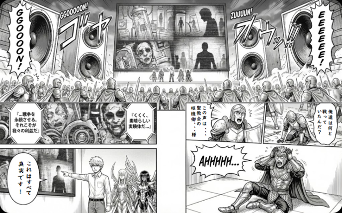 聖騎士団長の叫びが響く。 音声データは、彼らが裏で結託し、互いの地位と利益のために「八百長戦争」を演出していた事実を冷酷に暴いていく。兵士たちは自分たちが命を懸けていた戦いが、ただの「素材」や「実績」稼ぎのための舞台装置だったことを知ったのだ。