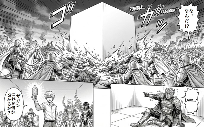 聖騎士たちが困惑に揺れる中、空中に巨大な光の膜が投影された。俺が《迷宮建築》の術式を応用して作り上げた、即席の巨大スクリーンだ。 次の瞬間、荒野の隅々まで、一人の男の声が響き渡った。