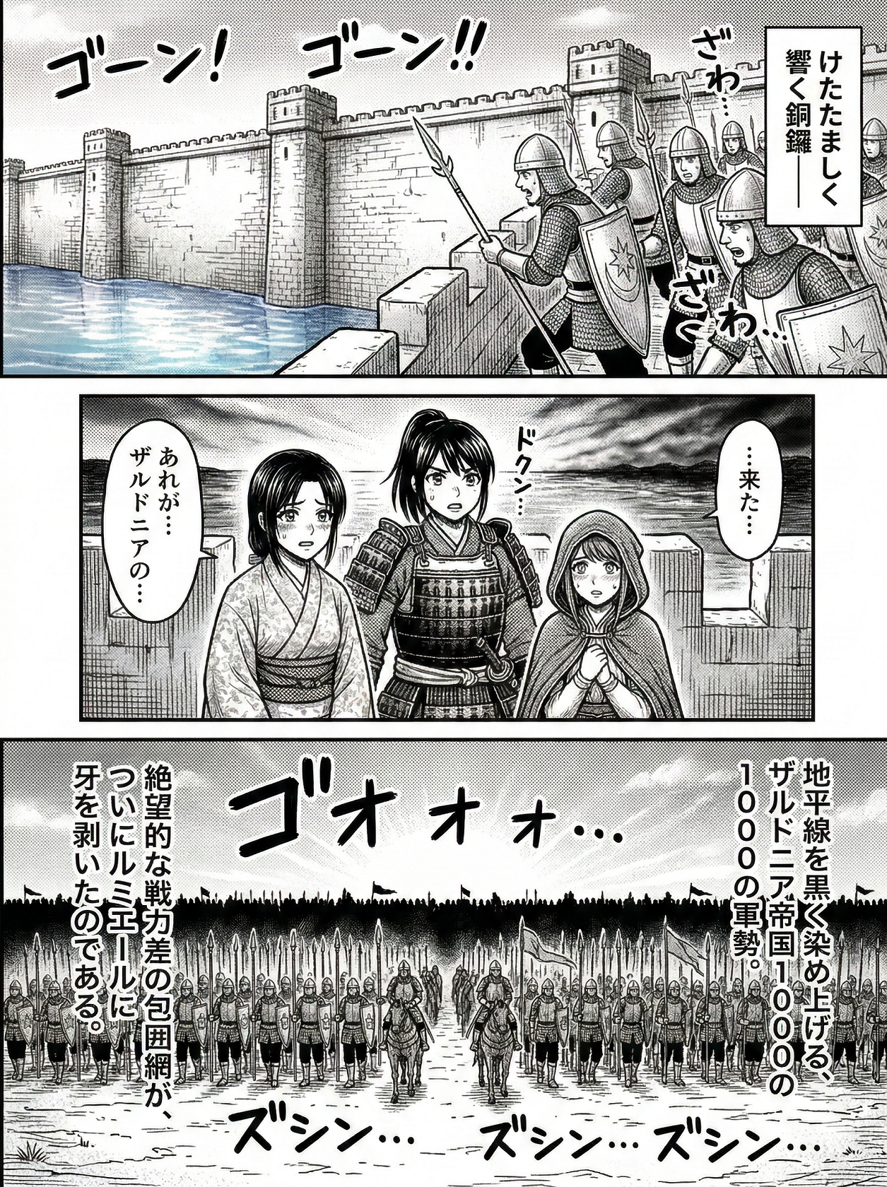 地平線の彼方から、朝靄を押し除けるようにして姿を現したのは、大地を黒く染め上げるような鋼鉄の波。ザルドニア帝国が誇る1000の重装歩兵と騎馬隊であった。