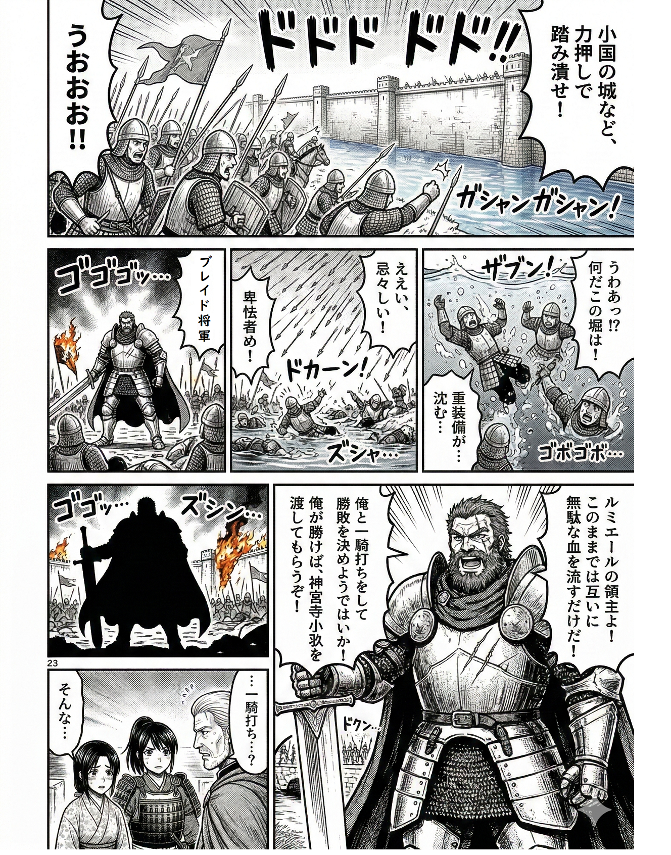 足場を失い、堀の縁で身動きが取れなくなったザルドニア兵たちは、ただの案山子と同じ。城内に一歩も踏み入ることができないまま、彼らは一方的な殺戮の的となり、澄んでいた水堀は瞬く間に敵兵の血と死屍累々で赤黒く埋め尽くされていった。