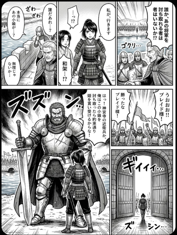ルミエールの兵士たちが驚いて振り返ると、そこには、漆黒の和風甲冑を身に纏い、黒髪をポニーテールに結い上げた一人の少女が、白銀の日本刀を腰に差し、静かに進み出ていた。