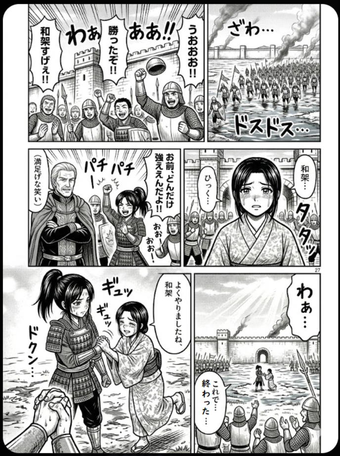 和架が刀を鞘に納め、城門へと歩み戻ると、そこには歓喜に沸く仲間たちが待ち受けていた。
