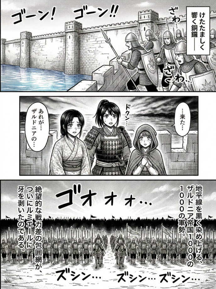 朝日に鈍く光る無数の槍と長剣、そして血のように赤いザルドニアの軍旗が風に翻る。対するルミエールの守備兵はわずか300。誰の目にも、その戦力差は絶望的であった。