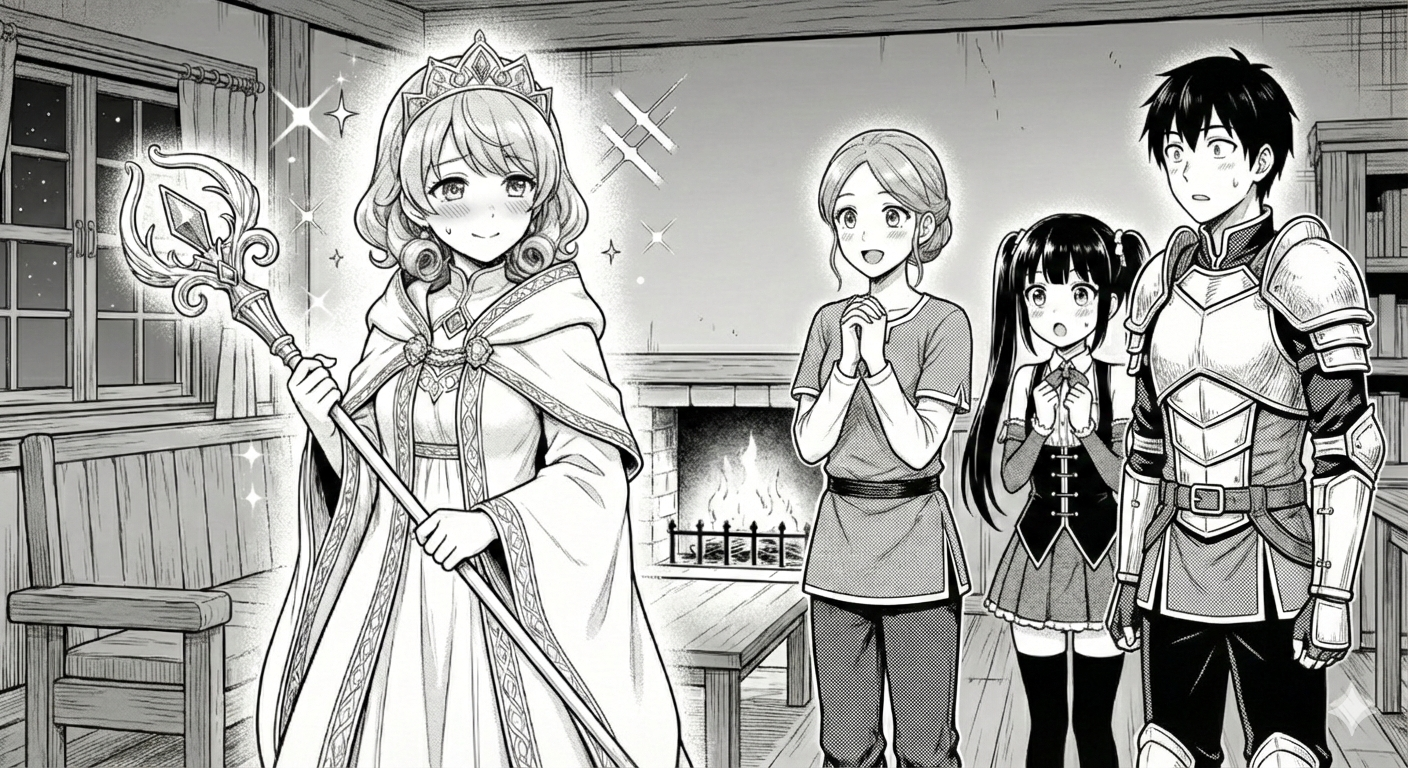 風呂上がりのセレニティが、新しい純白の神官服に袖を通し、リビングに戻ってくる。