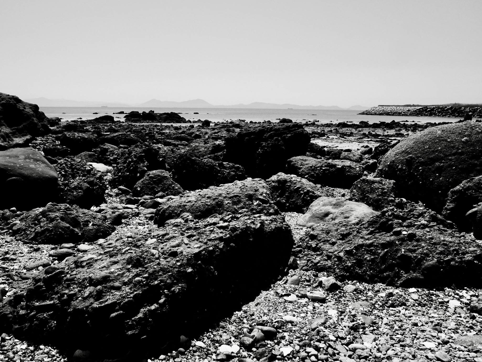 干潮の時間で普段隠れている岩場が見えている。黒みのある岩が独特の雰囲気を出している。