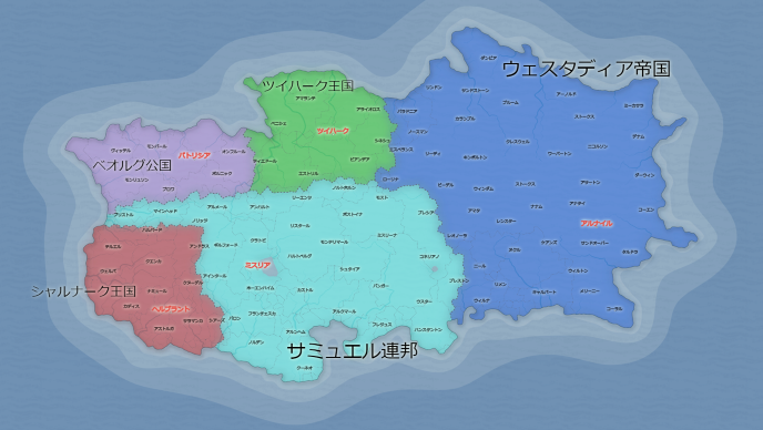 隣国:ウェスタディア帝国、べオルグ公国、サミュエル連邦