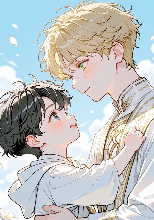 白髪に赤い目の長身の男の背には、真っ白な羽が大きく広がり、隣に立つ美麗な青年をその羽で覆っていた。包まれた青年は金にも銀にも見える光の粒がチラチラと散る漆黒の髪と、琥珀の瞳の中性的な男性だった。体格から男性とわかるのだが、着ている服は中途半端にはだけていて艶めかしい。