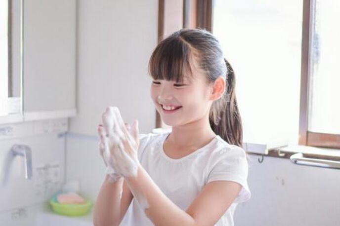 とにこやかな顔で泡にまみれたような自分の手や手元の実験道具?を見つめている。