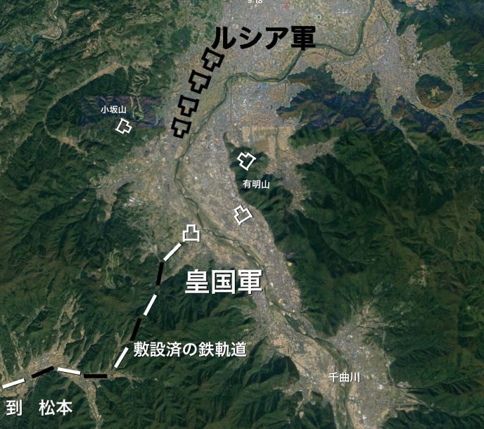 善光寺平に入ったルシア軍は千曲川の西を進軍して行く。善光寺平がくの字に折れ曲がる部分で皇国軍は待ち構えていた。