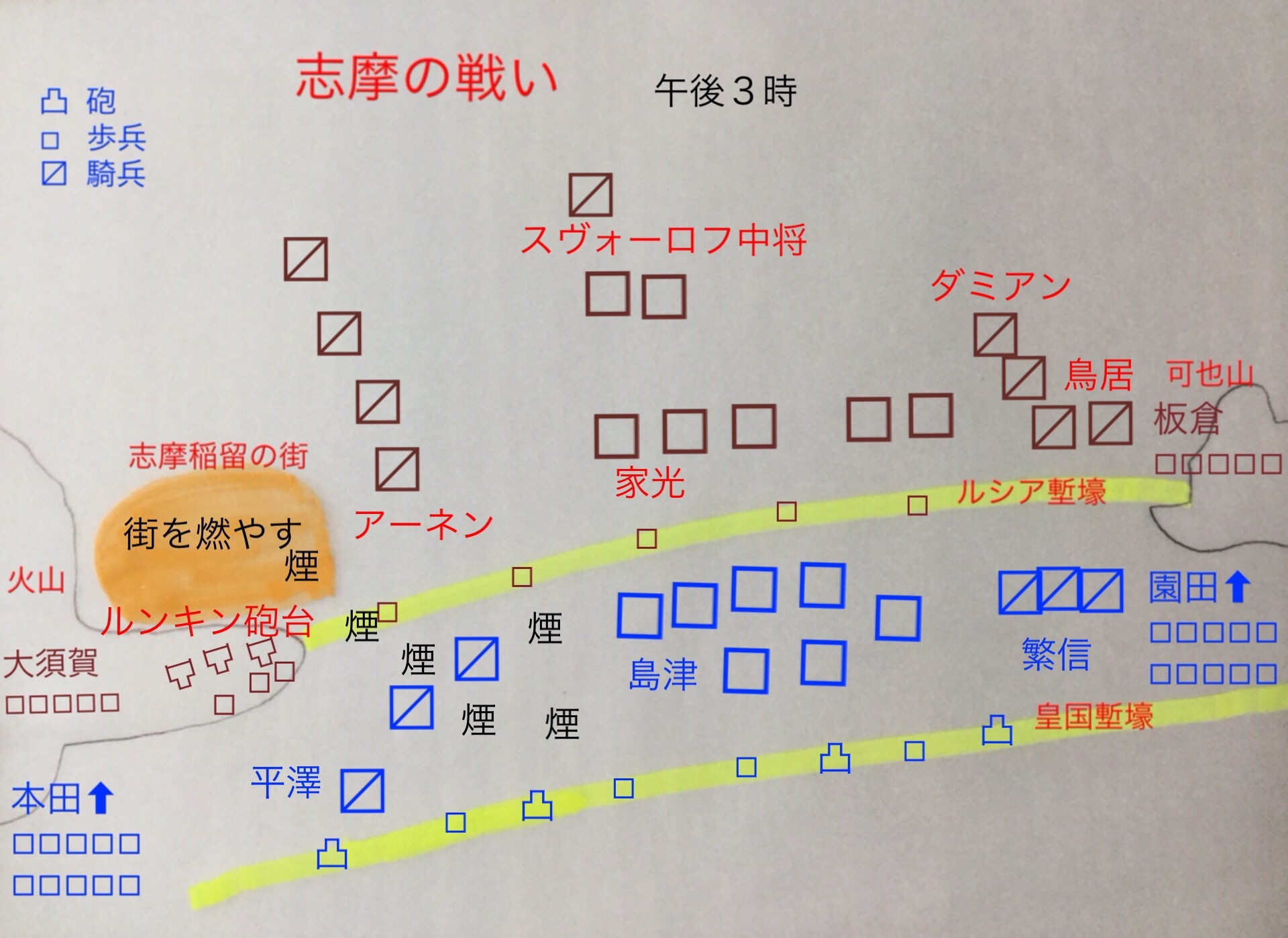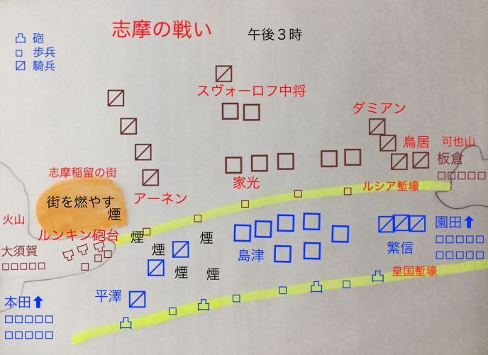 志摩稲留の街が炎上している。そこここから猛烈な煙をふきあげ、濃密な白い煙が南東に流れて行く。ルシアの塹壕線が煙で見えなくなる。