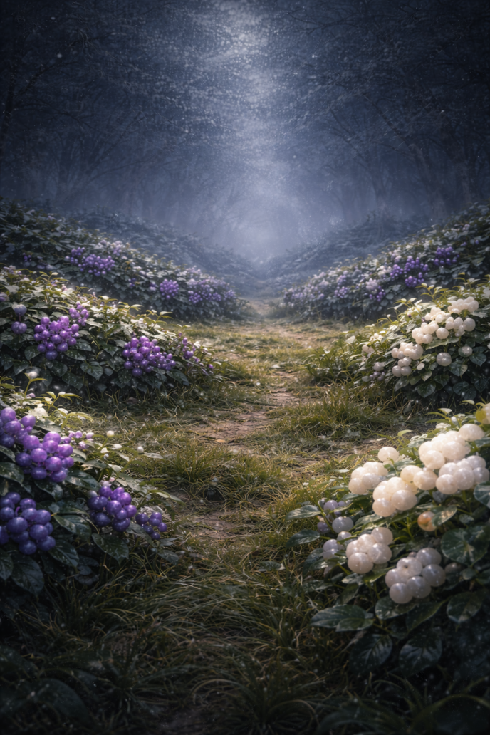 紫色の実と、白く半透明の実の茂みが群生していた。