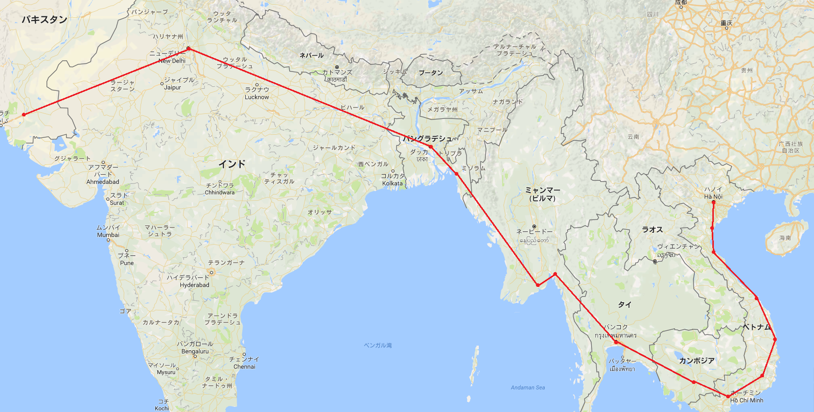 ハイデラバードからデリー、ダッカを通り、チッタゴン、ヤンゴン、バンコクへと至る道をイツキは作っていた。