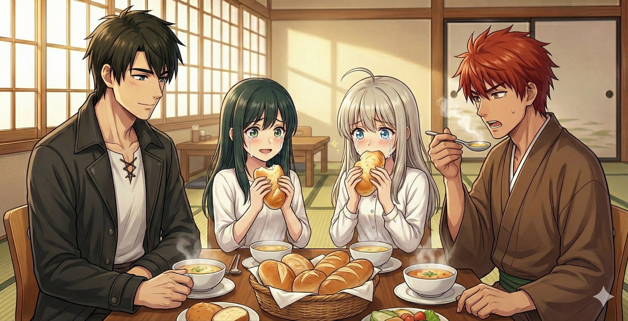 「知らなかった… パンが口の中でとろけるなんて… 皆で囲む食卓がこんなに温かいなんて…」