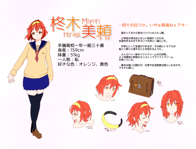 基本は強い口調だが、仕草や生活態度はthe女の子。下ネタに疎い。