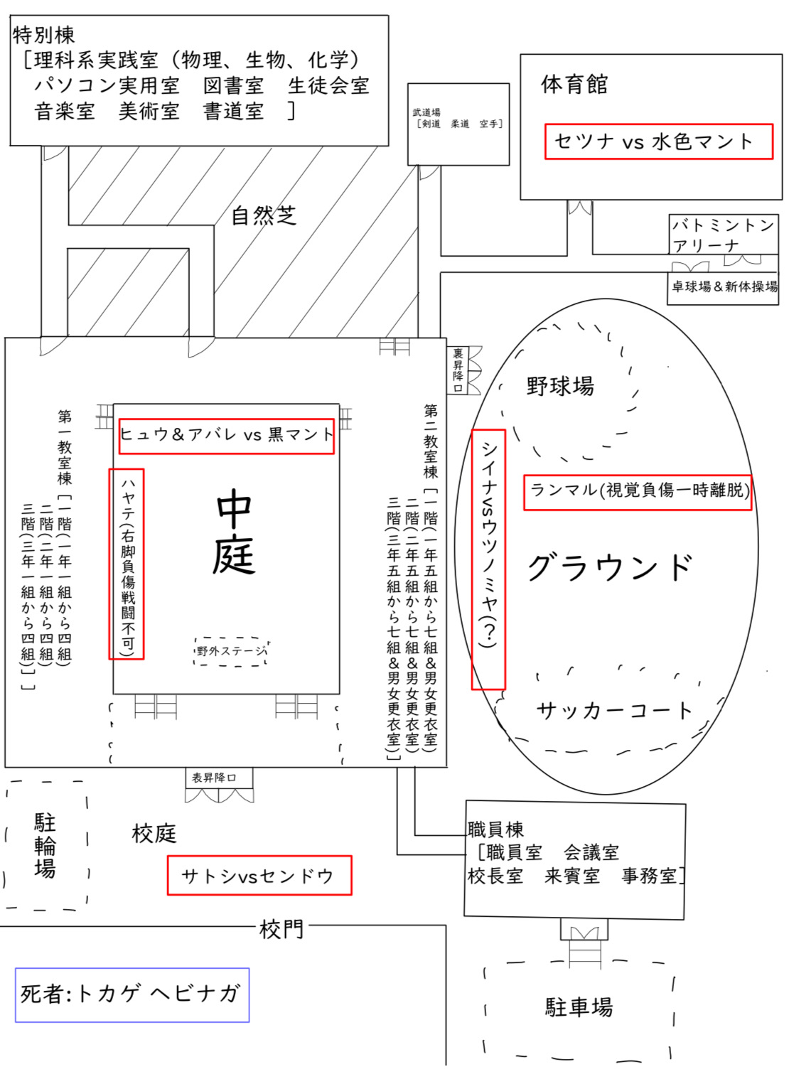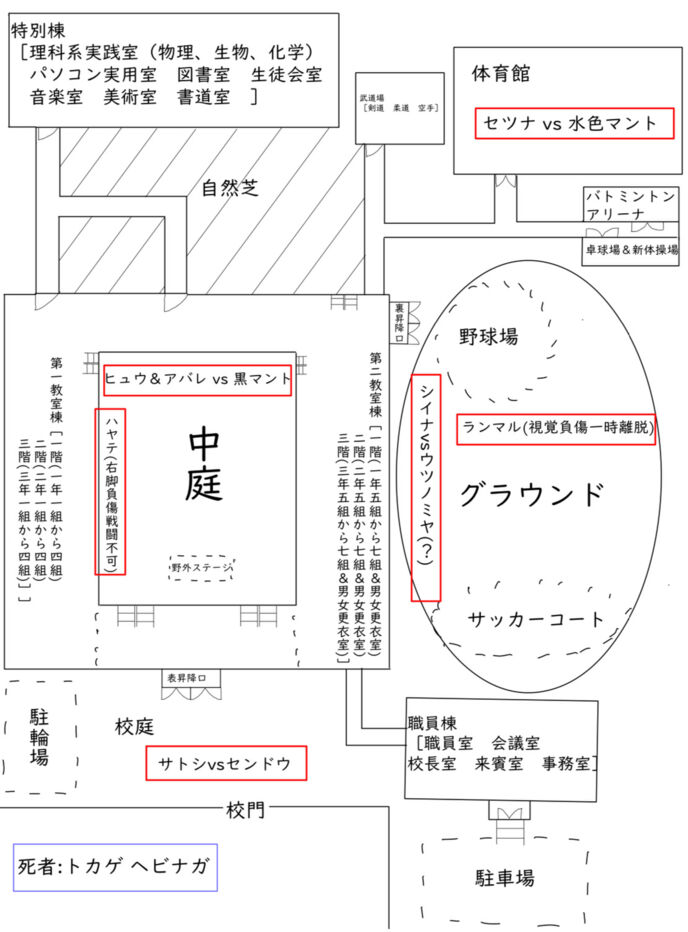 しかし、表昇降口前にある校門へ行って校外に逃げるにはサトシとセンドウの闘いを横切らなければならなかった