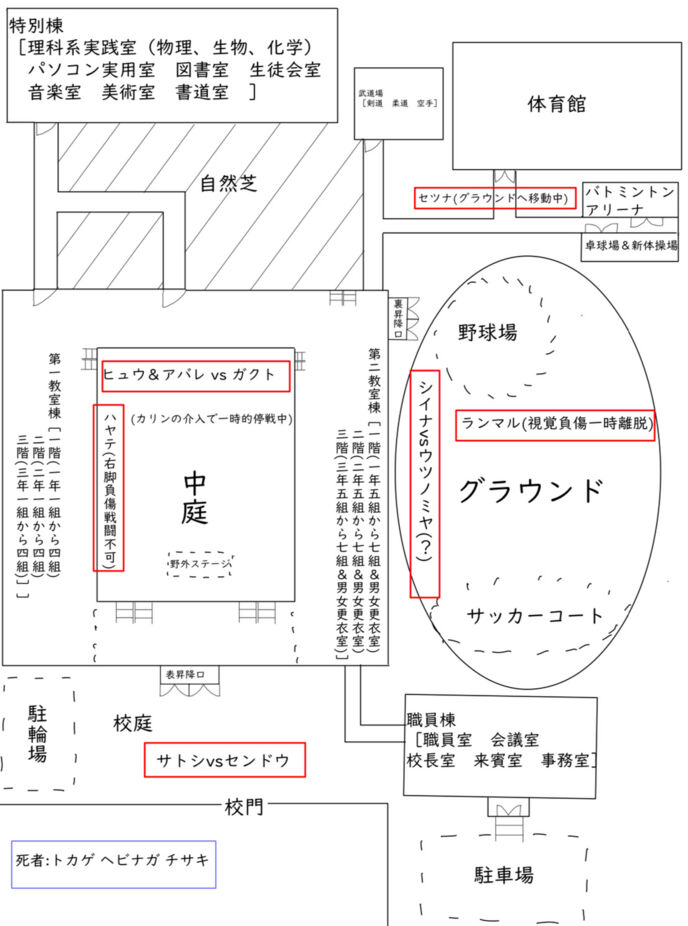 地面にしりを着けたチサキにそう言い放ちながら手放したナイフと槍を両手に持ってグラウンドの中へ駆け出して行った