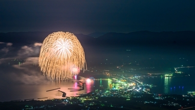 フィナーレでは尺玉と呼ばれる大きな金色の花火が、百発も一斉に打ち上げられた。