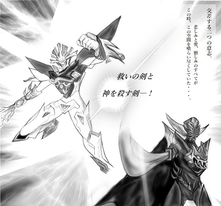 時の狭間の中ぶつかり合う光の機神(アマテラスコウタイジン)。正邪の太極図を描くように飛び交う二つの光(コウタイジン/ルシファー)。