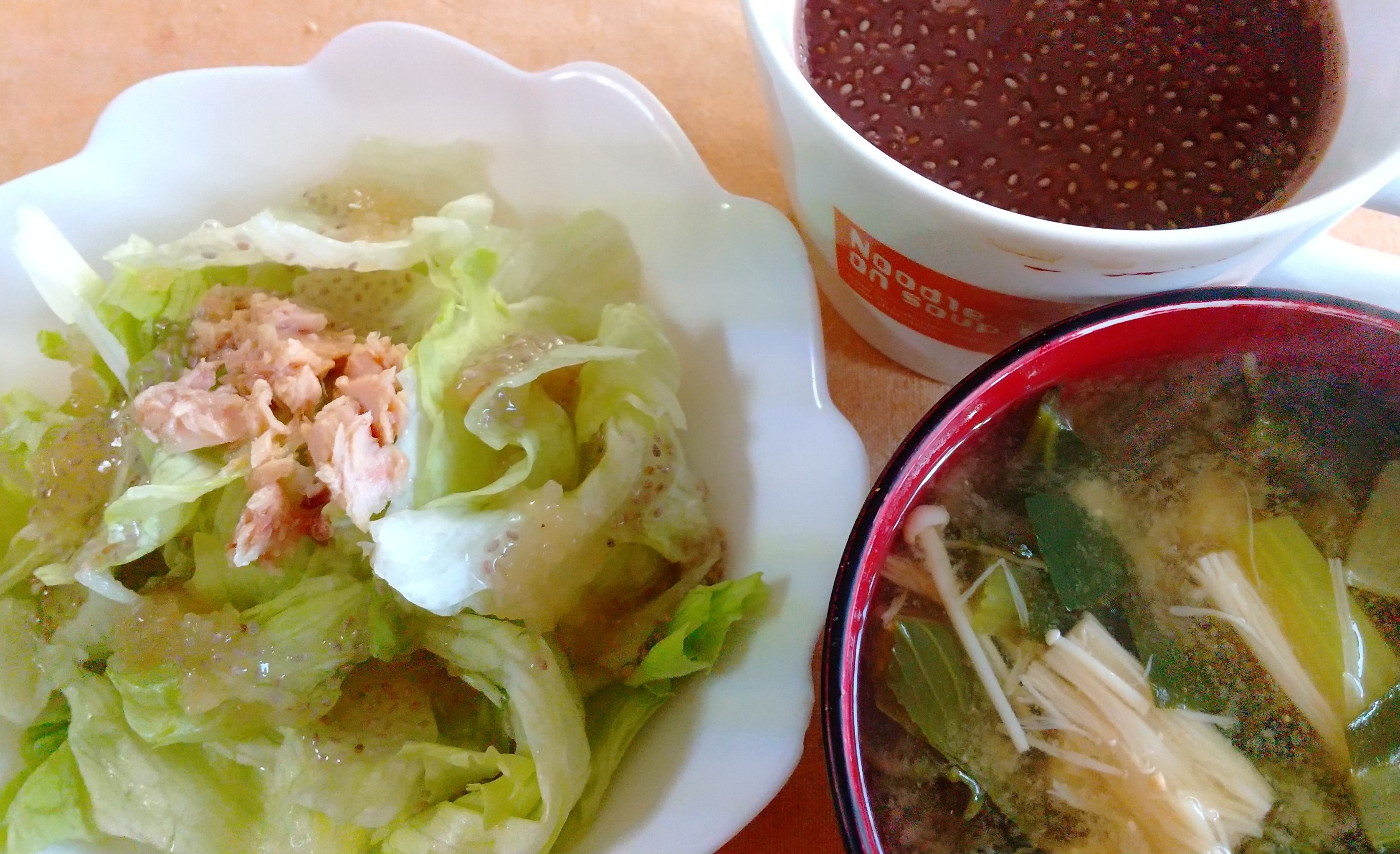 えのきと小松菜の味噌汁にチアシード入りココア。ツナのせレタスサラダ(チアシードと玉ねぎどっさりドレッシングかけ)。これにゴマベーグルをつけました。ゴマベーグルのカロリーが高いため、約500カロリー強となります。