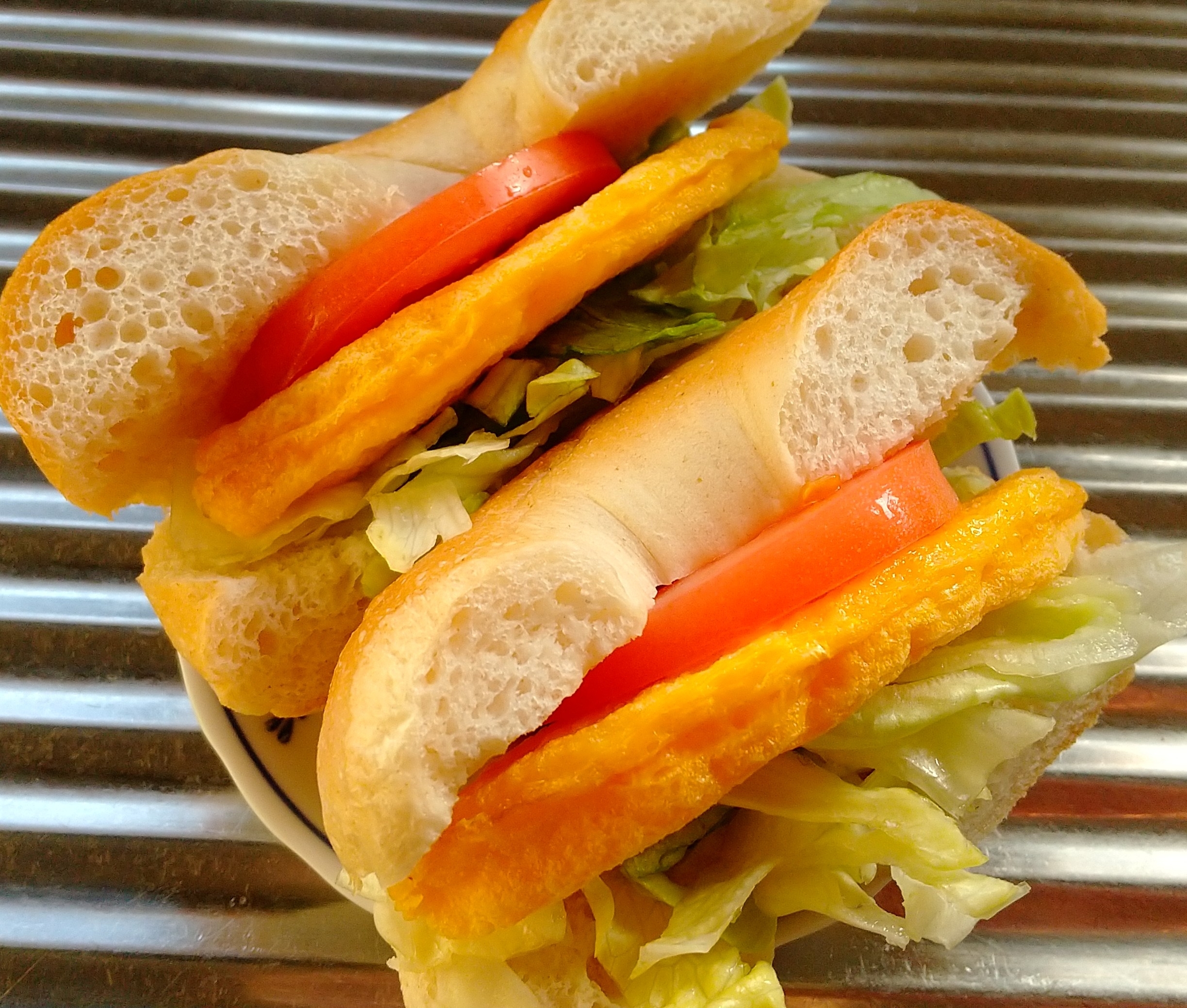 プレーンベーグルに、レタスとトマトとオムレツを半分づつ挟みました。二つで約300カロリーです。これに100カロリー強のお総菜をつけ、トマトジュースをつけていただきます。合計で約500カロリーとなります。