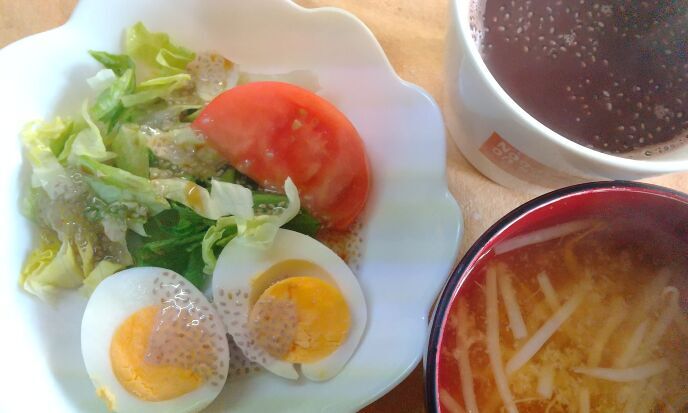 ゆで玉子サラダです。ゆで玉子にレタスとトマト添えとなります。チアシードと塩を振りました。約120カロリーです。毎朝サラダは、すっかり定番になりました。しかし冷蔵庫になにもなく、キャベツだけで寂しいときも……