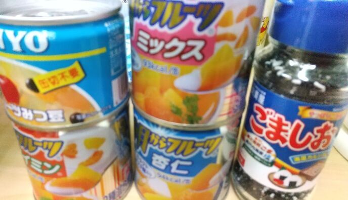 デザートの缶詰類です。今の缶詰は、プルトップで缶切り無しで開けられるのでべんりですね。それぞれ約100カロリー前後です。お弁当のお供にも、帰宅前の軽食に添えてもも良さそうです。