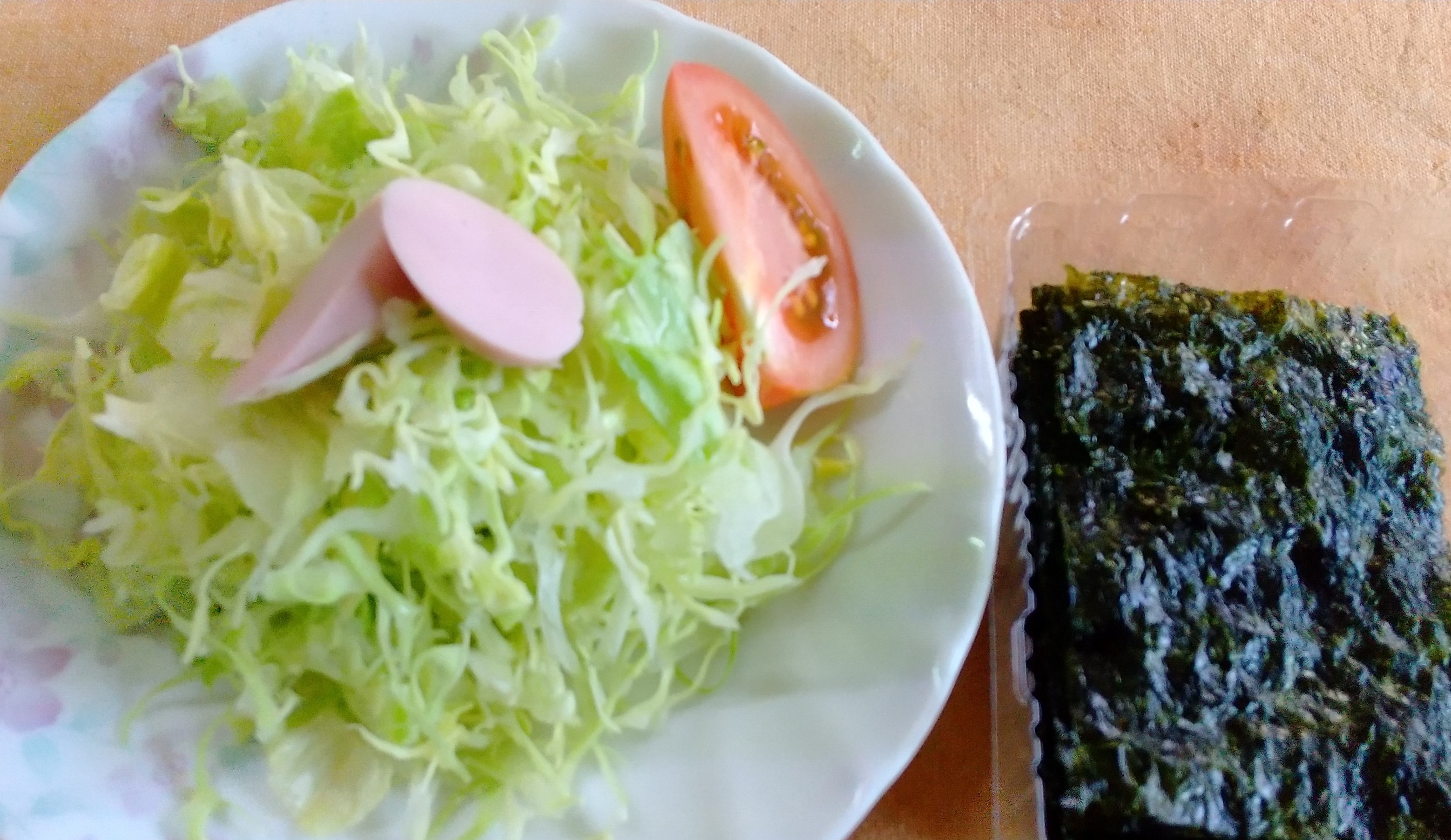 ▪フィッシュソーセージ一本・86カロリー。16カットで約6カロリー×3枚。千切りキャベツとレタス。チアシードとドレッシング込みで合計約70カロリー。