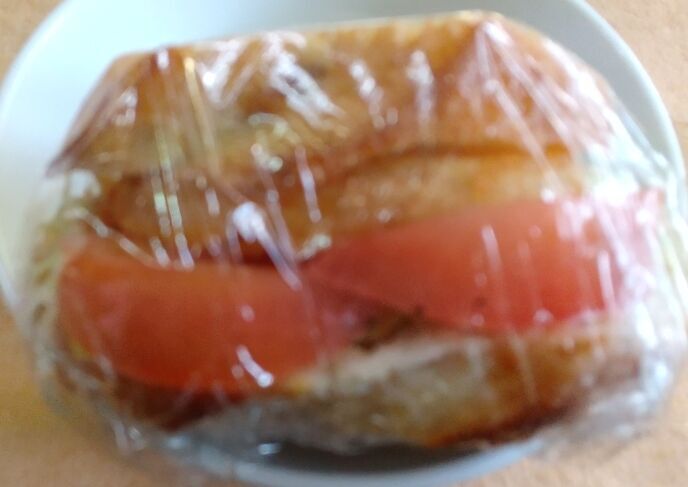 ペッパーチーズバケット薄切り二枚に、千切りキャベツとトマト。ハッシュドポテトを半分とトマトケチャップを挟みました。