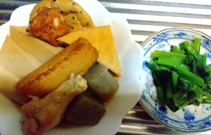 練りものは茹でこぼしをして油抜き。手羽元は良く洗い油で焼き、練りものとともに出汁と塩と醤油で煮込みました。ここで私の分は小鍋に取り分け、別に煮込みます。家族の分には砂糖とミリンを加え煮込みました。