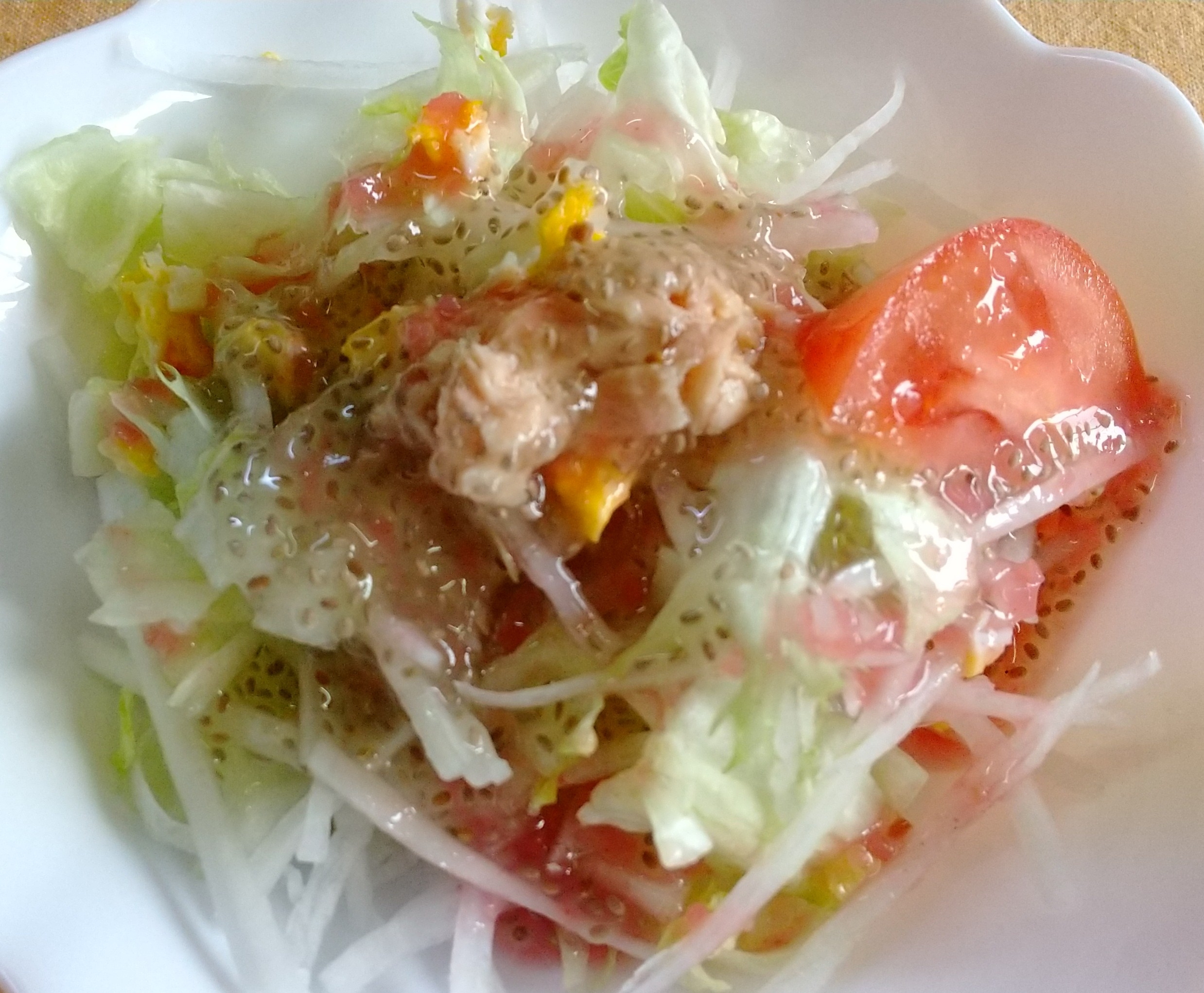 レタスと大根の千切りを混ぜたものに、ツナと炒り卵にトマトをトッピングしました。チアシードと桜色生姜ドレッシングをかけました。約100カロリーくらいです。