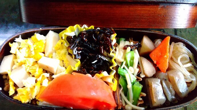 サラダチキン半分、約30カロリー。炒り卵少々、約20カロリー。ソイミート、約30カロリー。これらをご飯に散らしました。