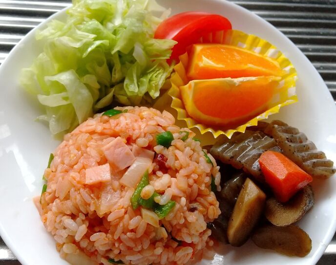 ラストにオレンジを添え、さらに残りもののこんにゃくの炒り煮を添えました。冷やご飯がたくさん冷蔵庫にあったための献立です。