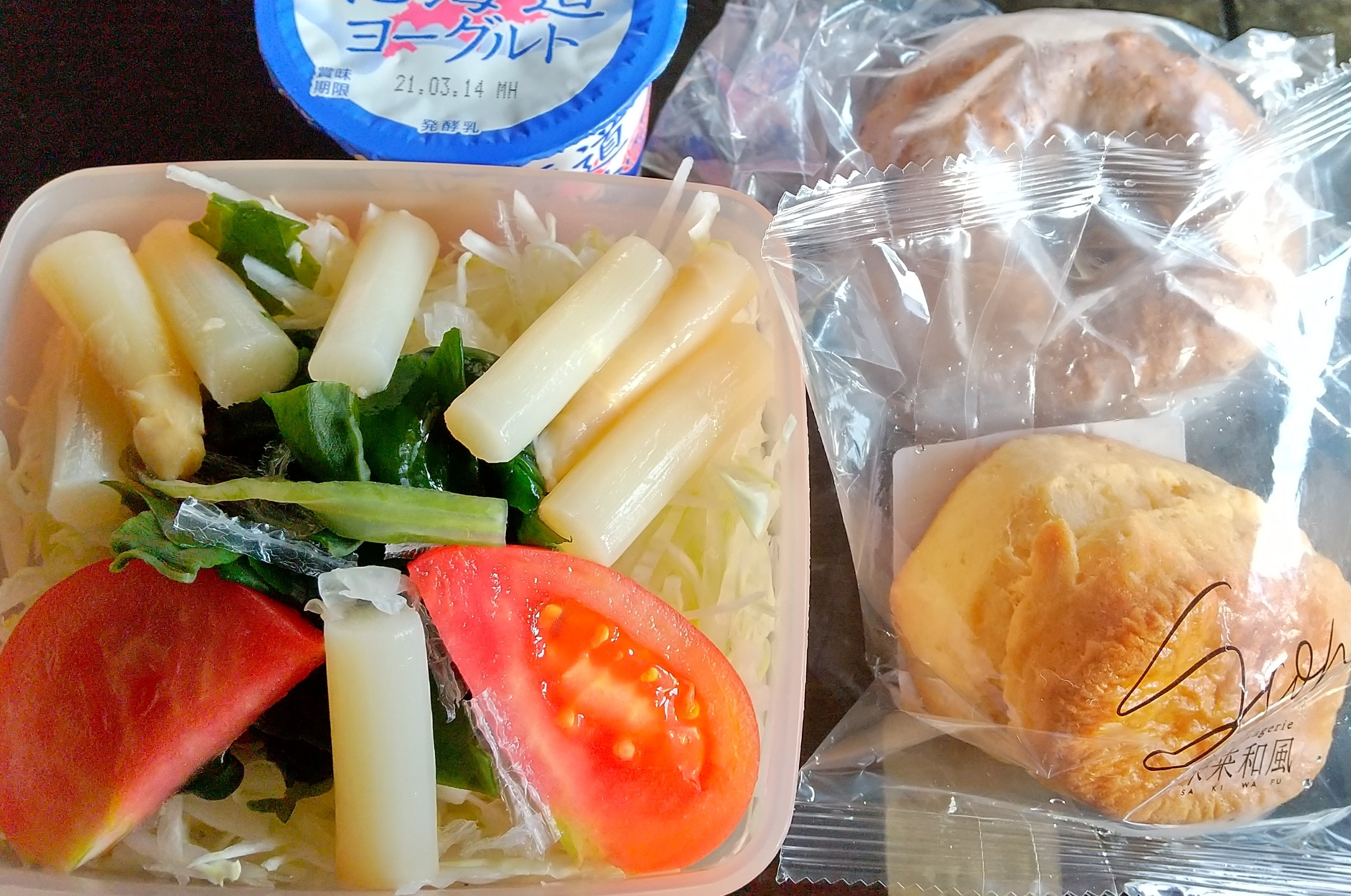 ベーグルとスコーンのみで、約450カロリーあるので、サラダは低カロリー具材のみにしました。ヨーグルトと紅茶を付けて、約500カロリー強です。