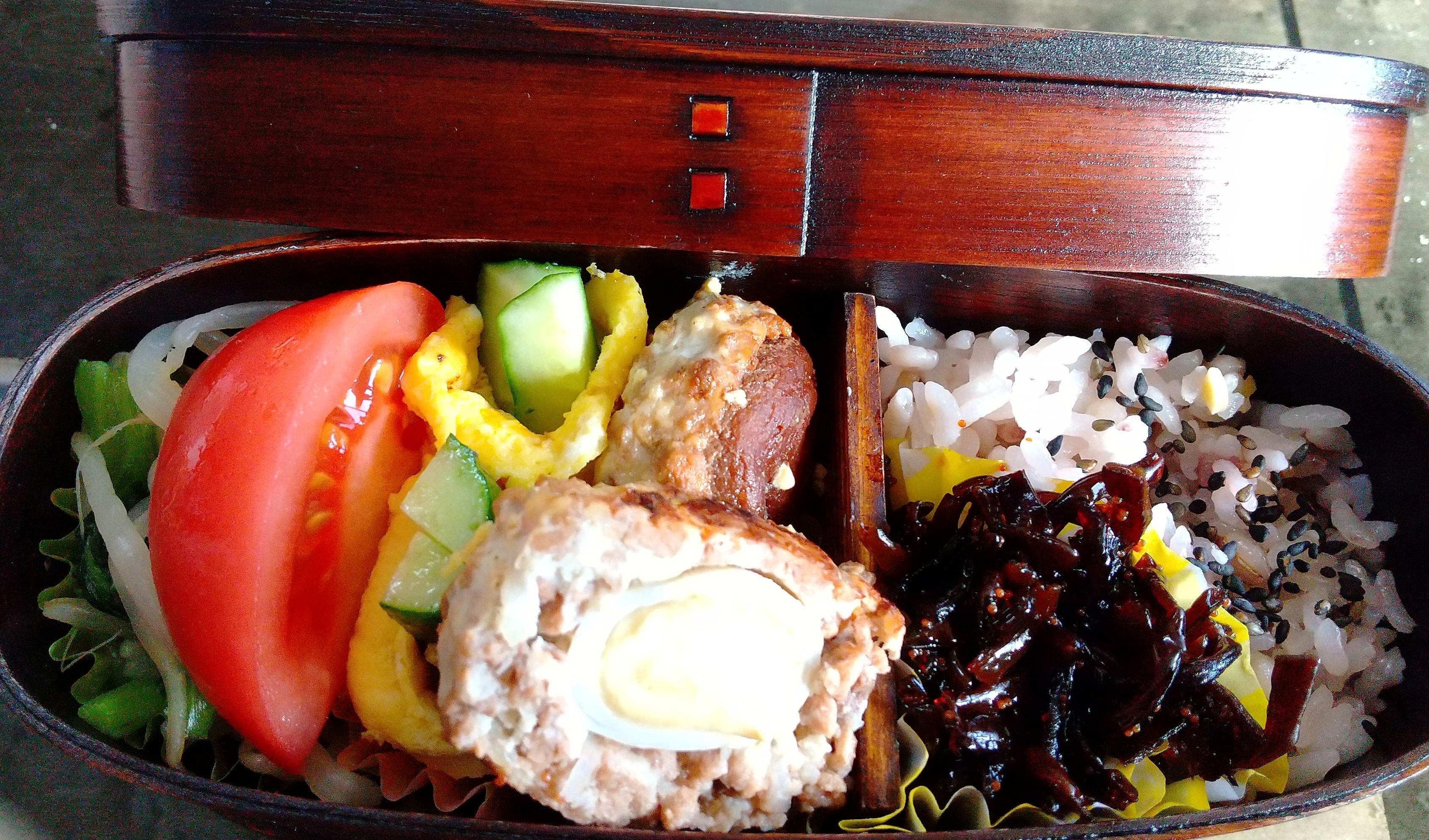 しおりを挟む曲げわっぱ弁当です。