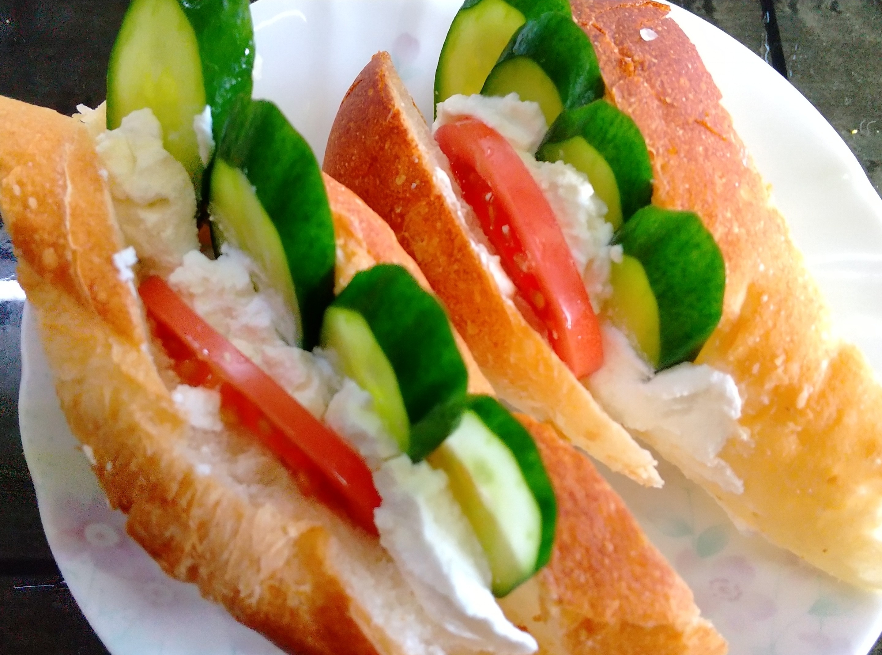 キュウリにトマトにカッテージチーズのサンドです。約300カロリーです。
