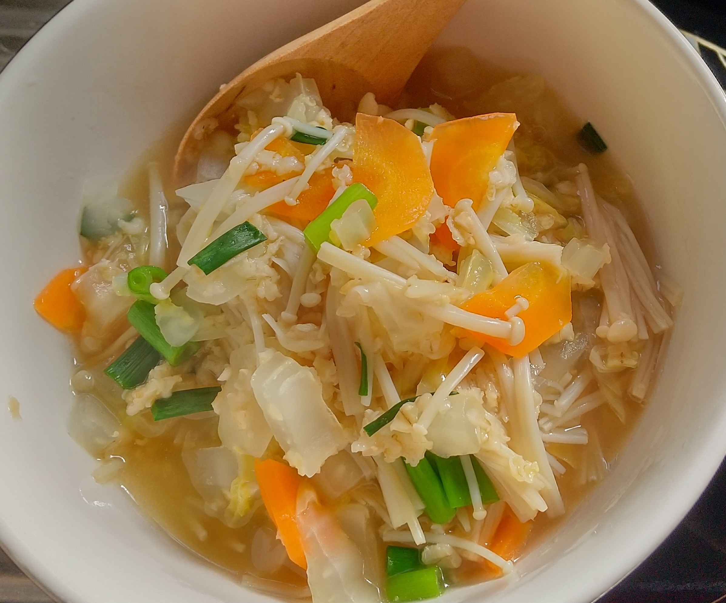 お野菜とえのき茸をたっぷり加えたオートミールを煮込み、出し醤油で味付けしました。