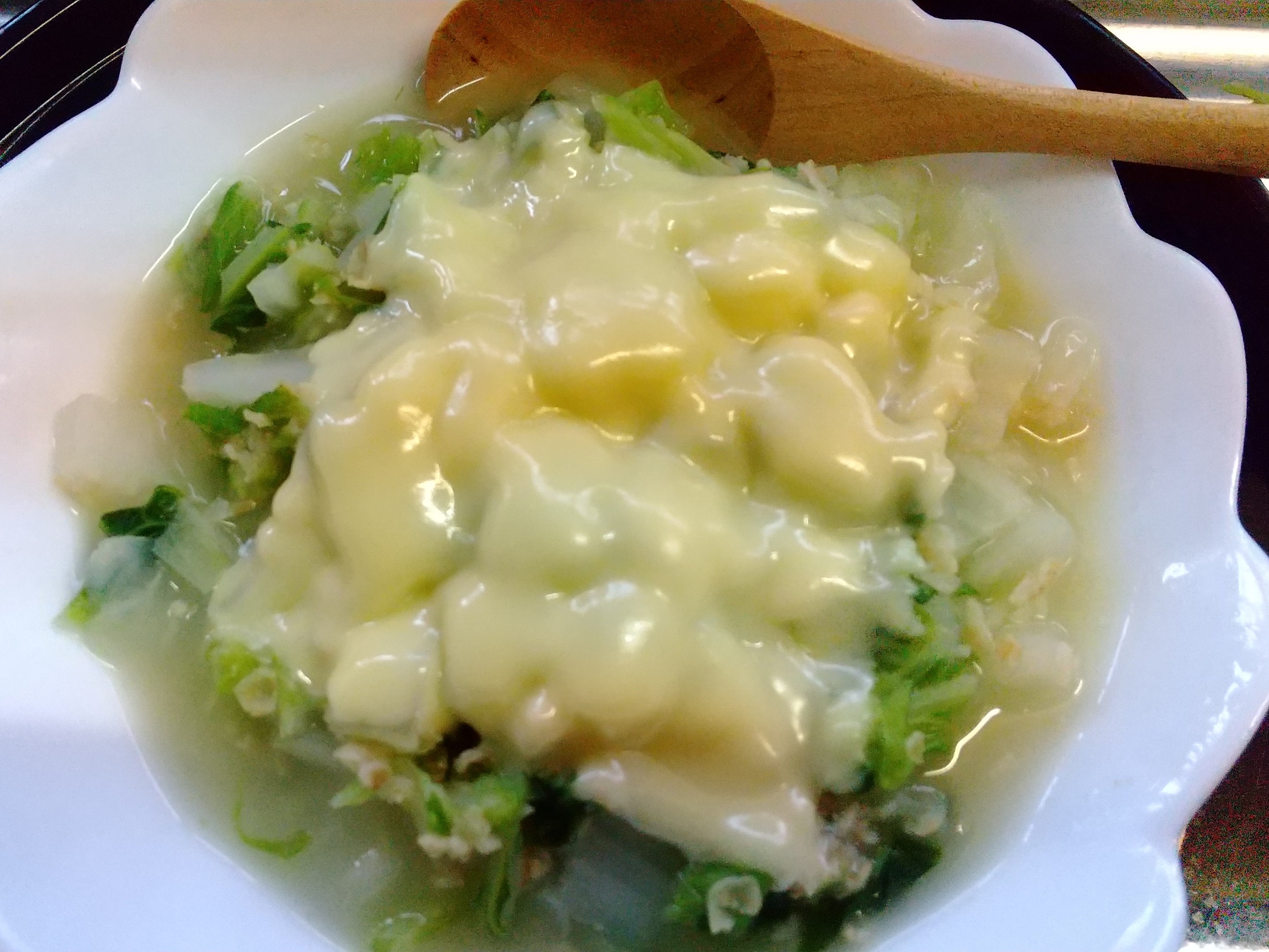 白菜たっぷり塩味に、スライスチーズを乗せました。毎朝お味を変えて楽しんでいます。チーズ乗せがどんな味にも合うのでお気に入りになっています。