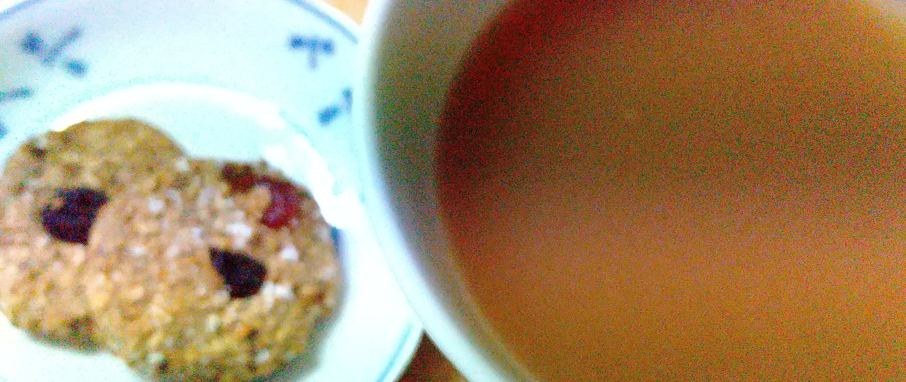 先日のオートミールクッキーを添えました。このクッキーですが、一晩置いたら固くなり……食べるのが辛いほどでした。キチンと作ったつもりなんですけど?しかし二枚でお腹がいっぱいになりました。お茶タイムに満腹になるなんて……しかし二度と作ることは無いでしょう。