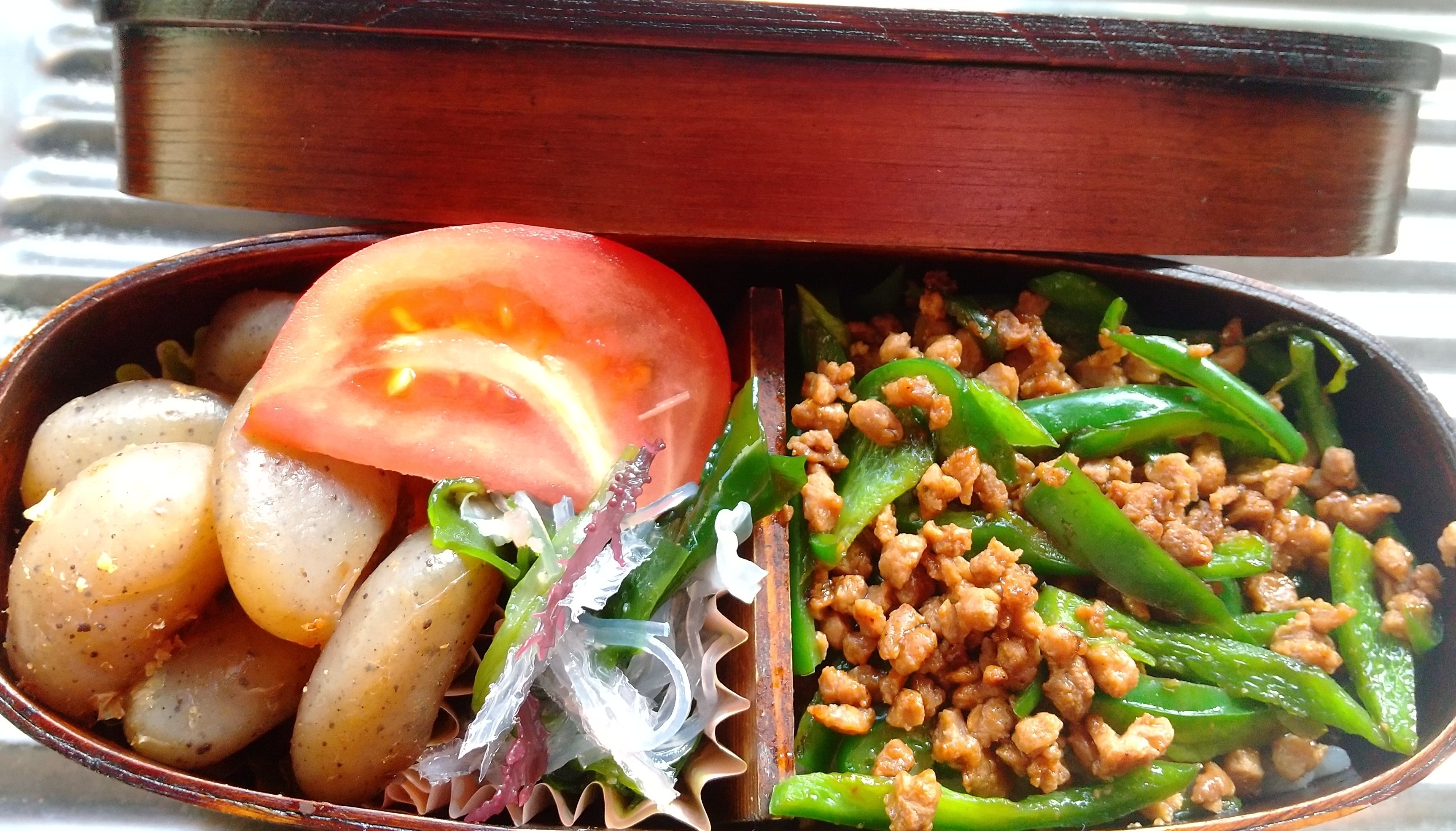 白ごはんにピーマン炒めをトッピング。普段よりかなりカロリーが抑えられたので、なにかおやつを追加しましょうか?取りあえずカロリー貯金をいたします。