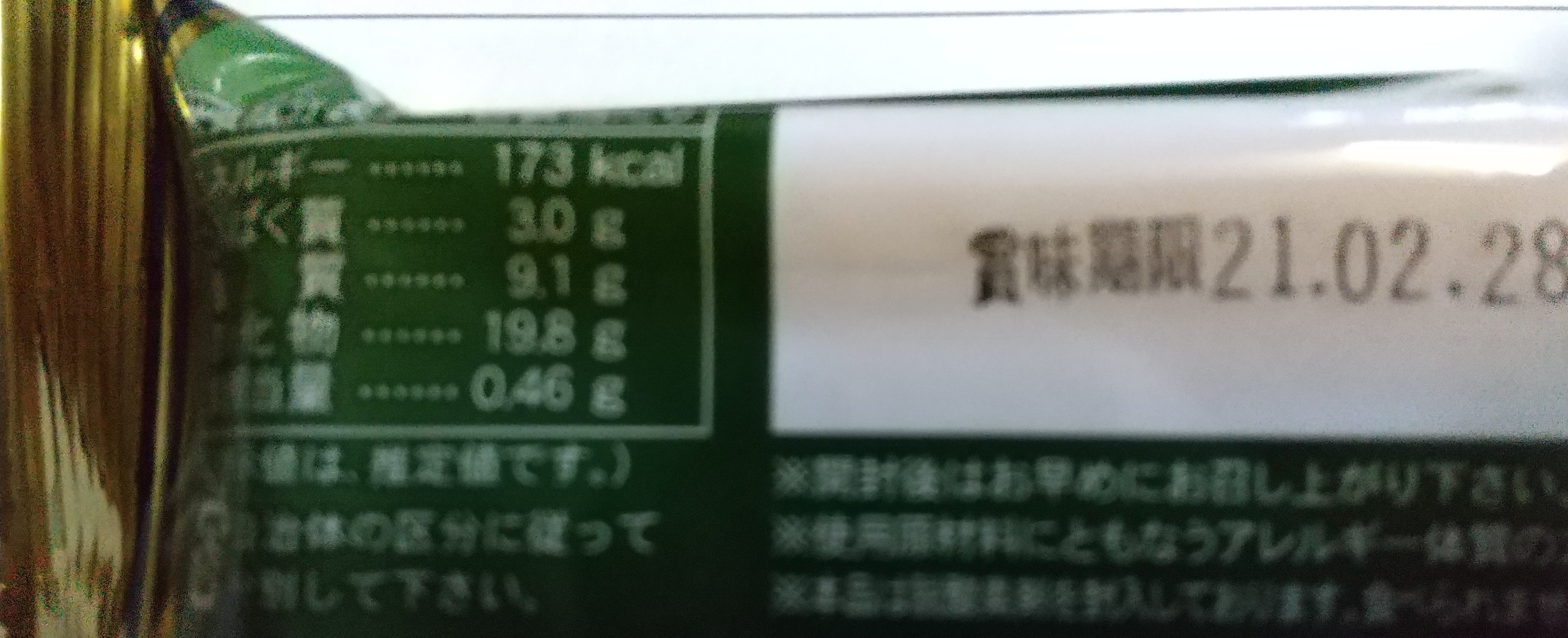 上がクルミ入りで448カロリー。下が抹茶入りで173カロリー。例えクルミが高カロリーの種子類だとしても、絶対に変です。