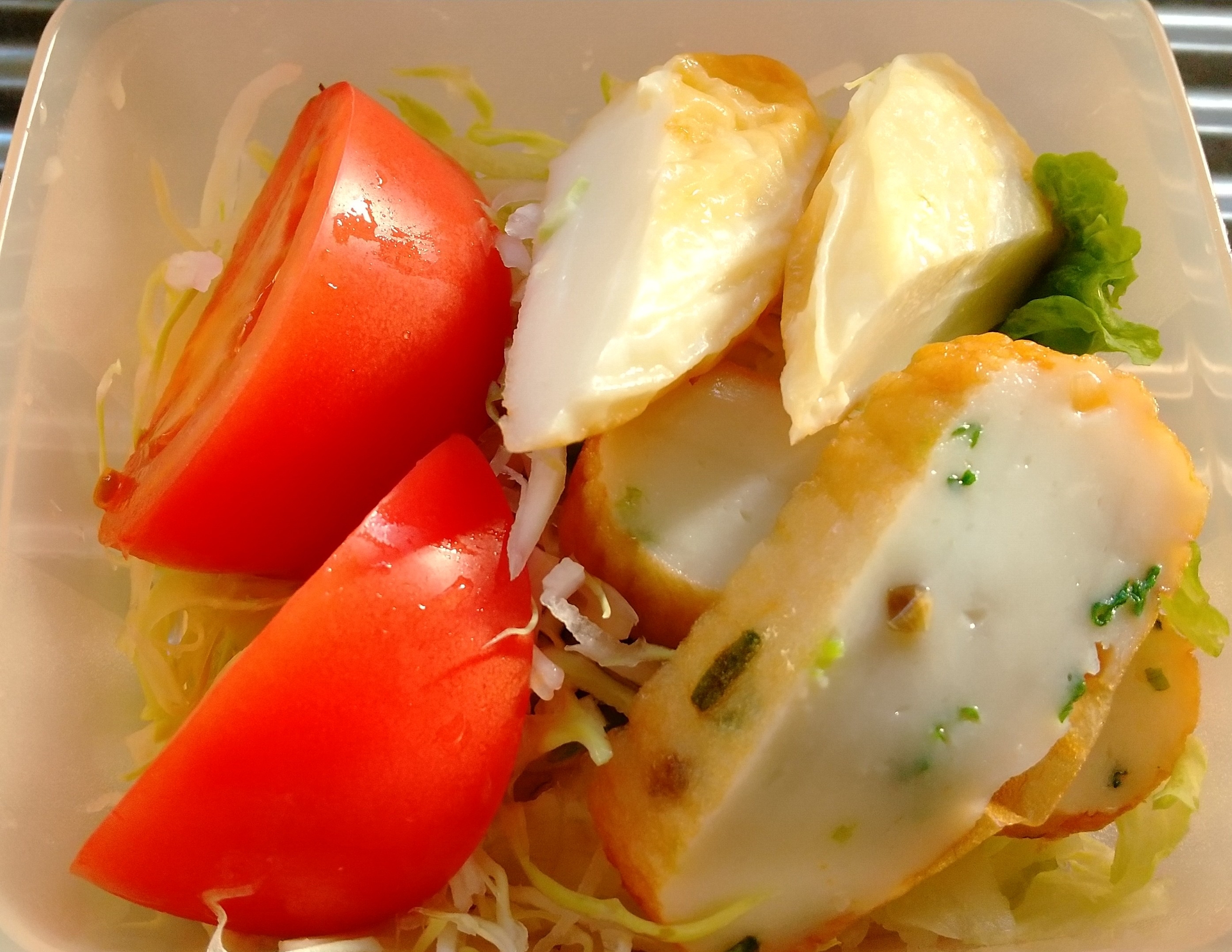 本日も、タッパでサラダを持参しました。親戚から贈られてきた、笹かまぼこいりです。野菜いりの四角い奴と、チーズいりのミニ笹かまです。笹かまぼこはカロリー低めで良いですね。
