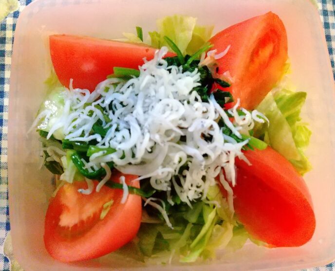 本日持参したサラダです。レタスにトマト。真ん中にホウレン草のおかか和え。しらす干しを散らして出来上がり。和風サラダです。ランチには、カップのきつねうどん247カロリーと、フルーツヨーグルトを付けました。